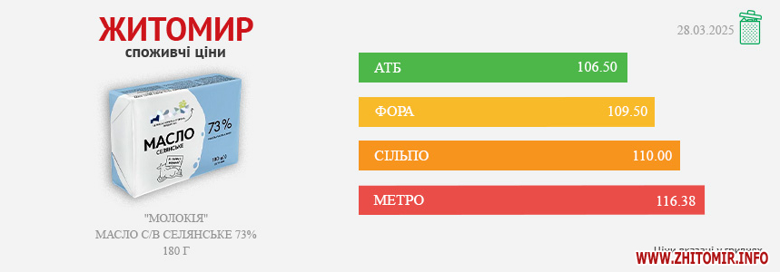 Моніторинг здійснено на основі інформації, отриманої за методом контрольної закупки 28.03.2025 р. у місцях продажу: АТБ, пр. Миру, 15 А, Фора, вул. Київська, 106, Метро, вул. Ватутіна, 55-в, Сільпо, вул. Житній ринок, 1