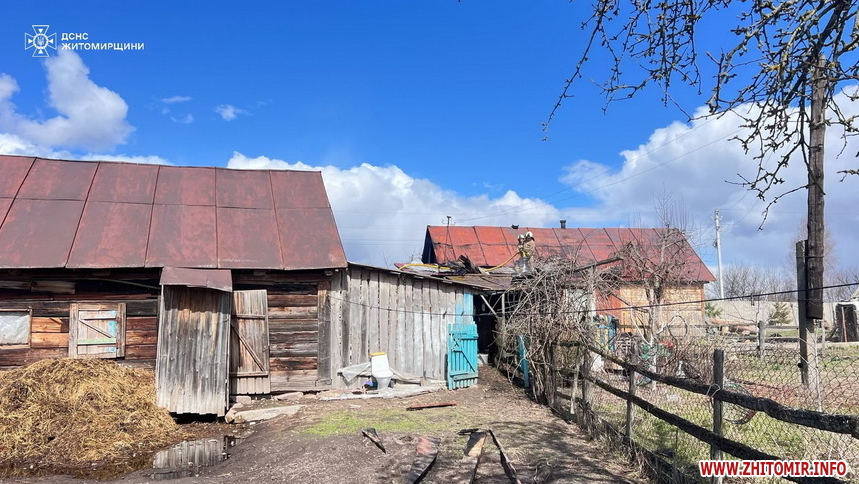 «10 квітня о 12:03 до Служби порятунку «101» надійшло повідомлення про пожежу на території приватного домоволодіння в с. Дружбівка Коростенського району. На місці події бійці ДСНС встановили, що загоряння виникло на горищі критого жестю житлового будинку та поширилося на господарську будівлю. Площа пожежі складала 70 кв. м. Існувала загроза розповсюдження вогню ще на дві господарські будівлі», - йдеться в повідомленні.