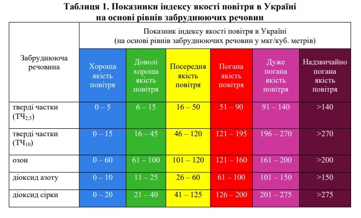 Скриншот Додатку 1 до Порядку інформування населення про якість повітря за основними показниками з використанням індексу якості повітря в Україні