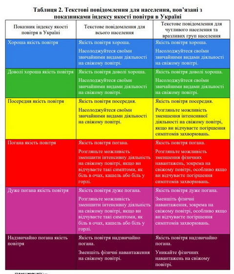 Скриншот Додатку 2 до Порядку інформування населення про якість повітря за основними показниками з використанням індексу якості повітря в Україні