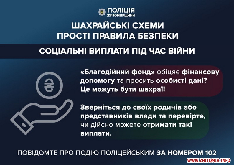 Звягельські поліцейські нагадують: фінансові виплати від міжнародних фондів не рекламують у соціальних мережах.