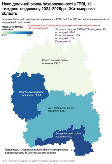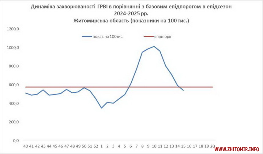На 15 тижні спостереження епідемічного сезону 2024-2025 років з ГРВІ фахівці продовжують фіксувати зниження кількості захворювань. Житомирська область знаходиться на неепідемічному рівні.