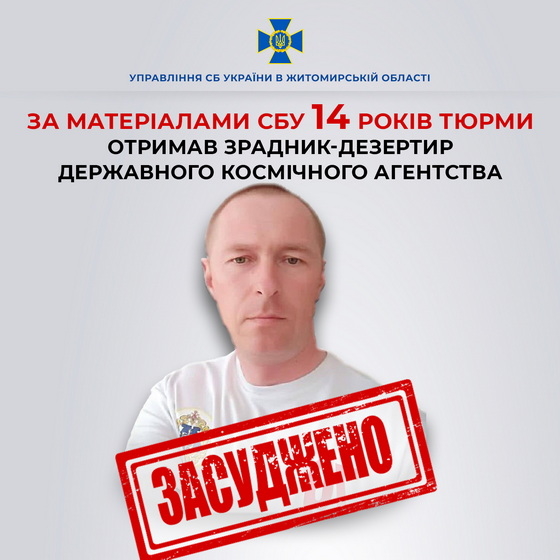 У Житомирі за матеріалами СБУ 14 років тюрми отримав зрадник-дезертир Державного космічного агентства України.