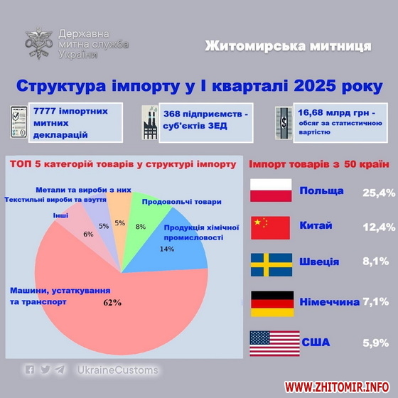 За підсумками першого кварталу 2025 року через Житомирську митницю найбільше товарів ввезлиз Польщі, Китаю, Швеції, Німеччини, США, Угорщини, Франції, Італії, Чехії та Литви.