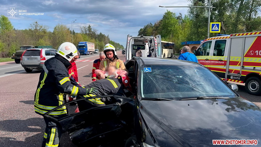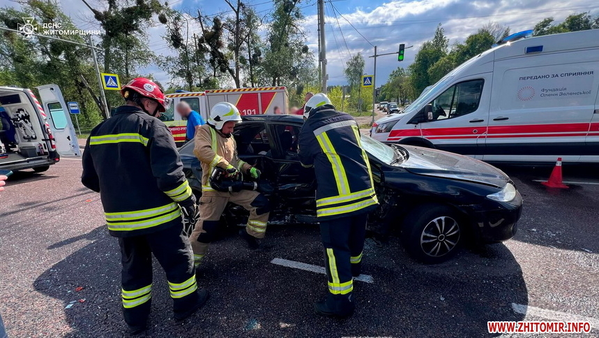 «ДТП у Житомирському районі: рятувальники деблокували пасажира з легкового авто. Внаслідок зіткнення двох легковиків одну пасажирку затисло в машині. За допомогою спецінструменту рятувальники деблокували її та передали медикам. Інші учасники аварії змогли вибралися самостійно. Також фахівці ДСНС змили паливно-мастильні матеріали з проїжджої частини дороги», - йдеться у повідомленні.