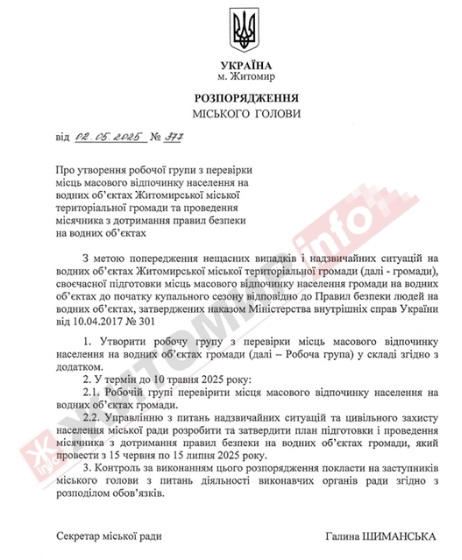 «З метою попередження нещасних випадків і надзвичайних ситуацій на водних обʼєктах Житомирської міської територіальної громади (далі — громади), своєчасної підготовки місць масового відпочинку населення громади на водних обʼєктах до початку купального сезону відповідно до Правил безпеки людей на водних обʼєктах, затверджених наказом Міністерства внутрішніх справ України від 10.04.2017 Nº 301. Утворити робочу групу з перевірки місць масового відпочинку населення на водних обʼєктах громади (далі — Робоча група) у складі згідно з додатком. У термін до 10 травня 2025 року: 2.1. Робочій групі перевірити місця масового відпочинку населення на водних обʼєктах громади. 2.2. Управлінню з питань надзвичайних ситуацій та цивільного захисту населення міської ради розробити та затвердити план підготовки і проведення місячника з дотримання правил безпеки на воді», - йдеться в розпорядженні.
