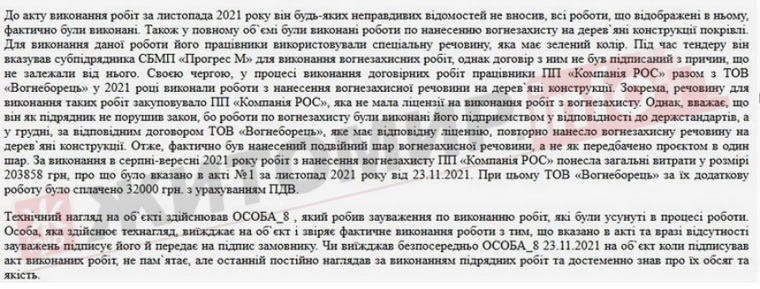 «Обвинувачений особа_4 вину не визнав та пояснив, що з 2008 року є керівником ПП «Компанія РОС». У 2021 році на загальних засадах ПП «Компанія РОС» виграла тендер з капітального ремонту «Енергоефективна термосанація Левківського ліцею Глибочицької сільської ради». Договір на виконання даних робіт був підписаний ним та начальником відділу освіти особа_10. Роботи на вказаному об`єкті проводились відповідно до затвердженої проєктно-кошторисної документації. Всі дані, які відображені в актах виконання робіт, були підтверджені на об`єкті, у тому числі з нанесення вогнезахисту на дерев`яні конструкції покрівлі, а їх вартість не перевищувала договірну ціну», - йдеться у вироці