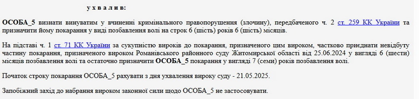 «10.03.2025 близько 07 години 00 хвилин особа_5, перебував у спальній секції гуртожитку № 2 ДУ «Житомирська виправна колонія (№4)», де у нього виник злочинний умисел, направлений на завідомо неправдиве повідомлення про підготовку вибуху ліцею № 21 м. Житомира», - йдеться у повідомленні.
