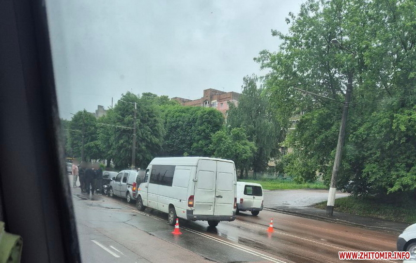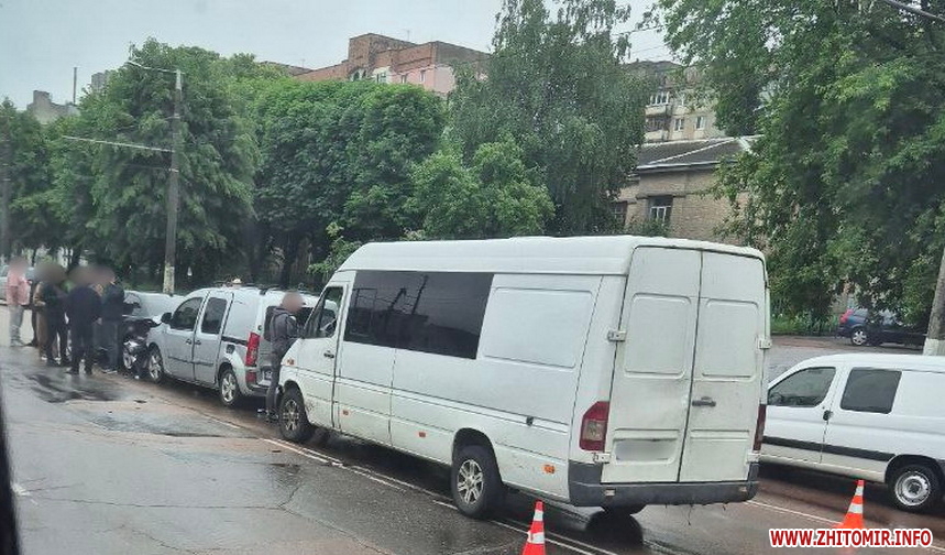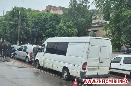 Вранці 28 травня у Житомирі, на проспекті Миру, зіштовхнулися три автомобілі, серед них – бус.