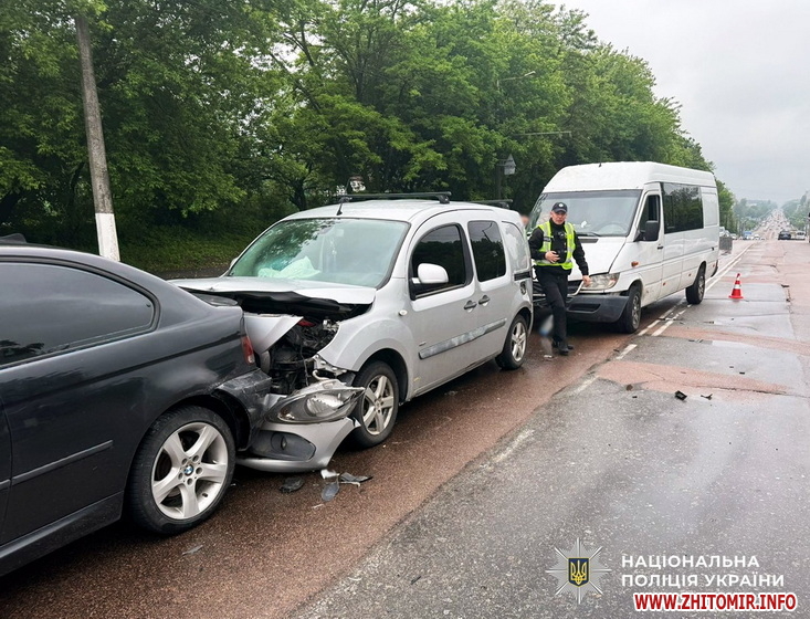 «На місці події працювала слідчо-оперативна група Житомирського районного управління поліції №1. Попередньо, сталося зіткнення між мікроавтобусом «Mercedes-Benz» та легковиком тієї ж марки, що рухалися в попутному напрямку. Унаслідок удару легковик за інерцією зіткнувся з автомобілем «ВМW», який знаходився попереду», - розповіли правоохоронці.