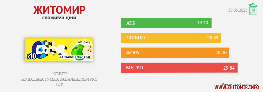 Моніторинг здійснено на основі інформації, отриманої за методом контрольної закупки 30.05.2025 р. у місцях продажу: АТБ, пр. Миру, 15 А, Фора, вул. Київська, 106, Метро, вул. Ватутіна, 55-в, Сільпо, вул. Житній ринок, 1