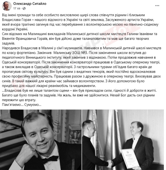 «Від імені громади та себе особисто висловлюю щирі слова співчуття рідним і близьким Владислава Горая – нашого відомого в Україні та світі земляка, Заслуженого артиста України, який вчора трагічно загинув під час перебування з волонтерською місією на північно-східному кордоні Україні. Син відомих на Малинщині викладачів Малинської дитячої школи мистецтв Галини Іванівни та Вікентія Францовича Гораїв, він був дійсно дуже талановитим та мав ще багато творчих задумів», - Ситайло.