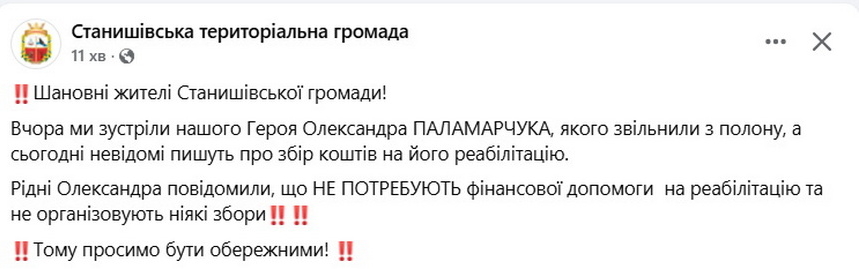 «Шановні жителі Станишівської громади. Вчора ми зустріли нашого Героя Олександра Паламарчука, якого звільнили з полону, а сьогодні невідомі пишуть про збір коштів на його реабілітацію. Рідні Олександра повідомили, що не потребують фінансової допомоги на реабілітацію та не організовують ніякі збори! Тому просимо бути обережними», - йдеться в повідомленні.