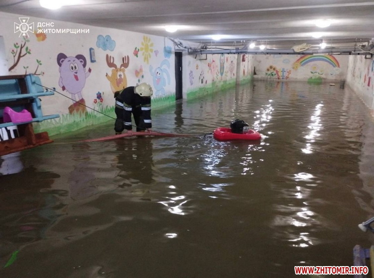 Одразу в кількох локаціях у місті Звягель проводилися роботи з ліквідації підтоплень: вода потрапила у підвал дитячого садочка, а також у підвали та двори багатоповерхівок.