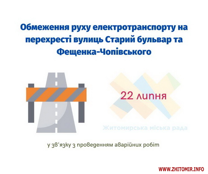 Через аварійні роботи на каналізаційній мережі 22 липня у Житомирі на перехресті вулиць Старий бульвар та Фещенка-Чопівського буде обмежений рух електротранспорту.