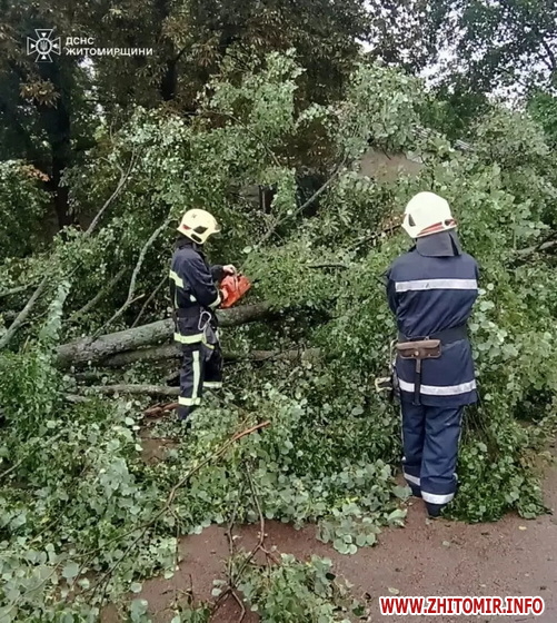 У селі Раковичі Житомирського району та в селищі Народичі Коростенського району рятувальники ліквідовували наслідки падіння дерев: за допомогою бензопил розрізали стовбури й гілля, після чого прибрали залишки з проїжджої частини, аби відновити безпечний рух транспорту.