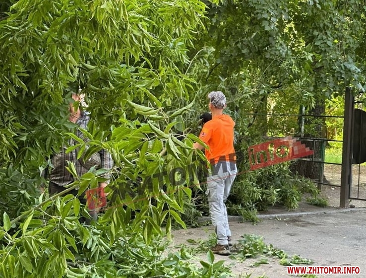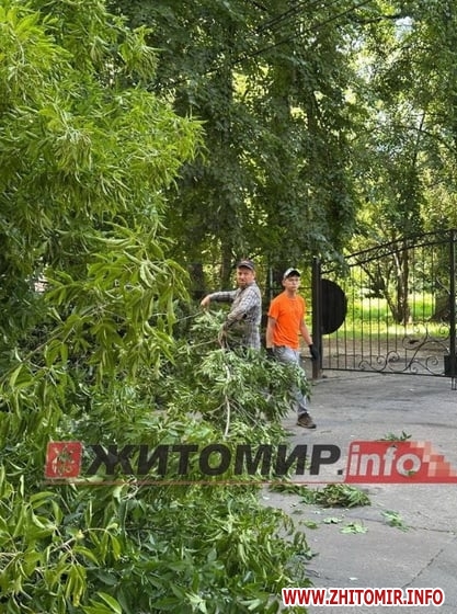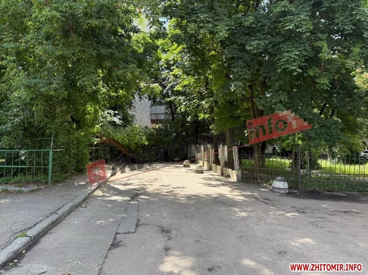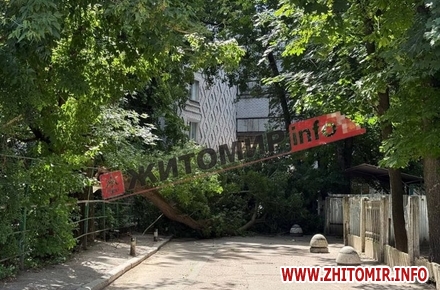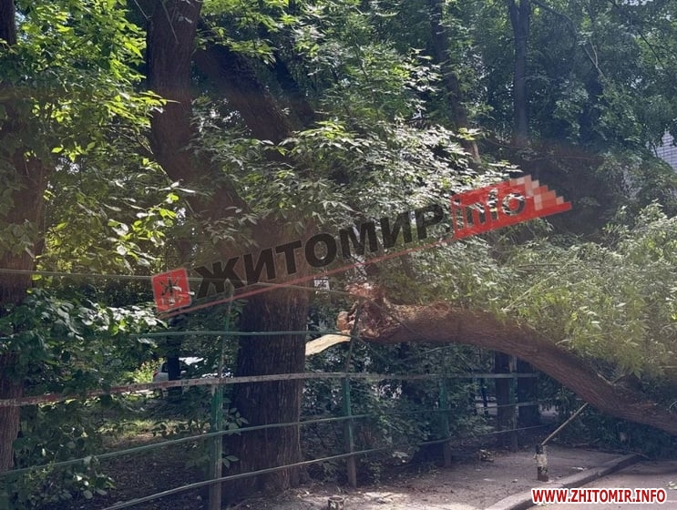На фото видно, що від дерева відчахнулася велика гілка, яка перегородила заїзд у двір між будинками №5 та №8 та майдані Корольова. Цим заїздом також користуються, щоб потрапити у внутрішній двір Житомирської міської ради.
