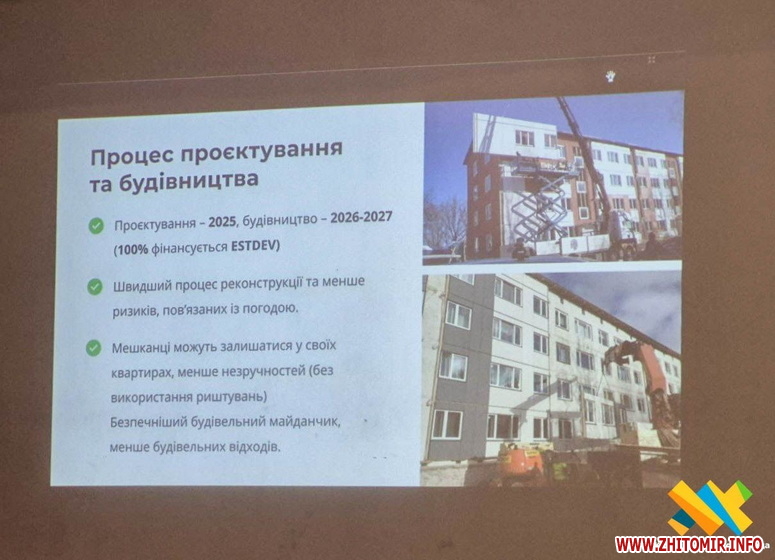 "Заміряється будинок, точне розташування вікон, і на заводі виготовляються готові утеплені фасадні панелі, які монтуються на місці. Наче з конструктора. Це прискорює роботу і зменшує дискомфорт для мешканців. Тому і відселення мешканців це не потребує", — пояснюють естонці. Кажуть, вони реалізували тисячі таких об’єктів — і цегляних, і панельних будинків, дуже схожих на житомирські.