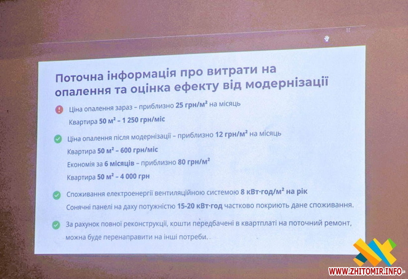 «Якщо наразі ціна за опалення квартири 50 м кв. становить 1250 грн за місяць, тобто близько 25 грн за м кв., то після модернізації за таку квартиру сплачуватимуть 600 грн за місяць , тобто близько 12 грн за м кв. За шість місяців економія на опаленні такої квартири становитиме 4 тисячі гривень. Передбачаються і сонячні панелі на даху будинку, які частково покриють споживання», — пояснюють експерти.