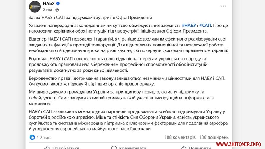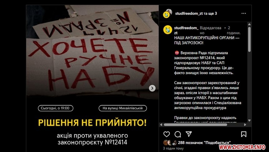 Нагадаємо, що законопроєкт №12414, який робить незалежні антикорупційні інституції НАБУ та САП залежними від рішень генерального прокурора, у в цілому проголосували 263 народних депутати, всі шість мажоритарників від Житомирської області (5 з фракції «Слуга народу» і 1 з депутатської групи «Довіра») проголосували «за».