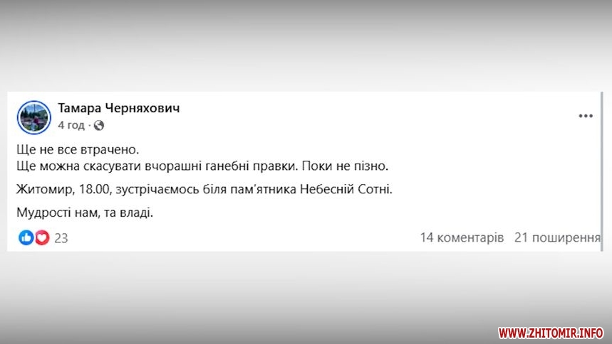 Таке рішення викликало обурення серед громадян. Люди почали виходити на протести у різних містах України, зокрема, у Києві, Львові, Одесі, Дніпрі. Житомиряни також у соцмережах 23 липня закликали вийти на мирні акції проти ухваленого закону.