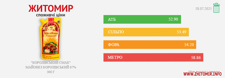 Моніторинг здійснено на основі інформації, отриманої за методом контрольної закупки 18.07.2025 р. у місцях продажу: АТБ, пр. Миру, 15 А, Фора, вул. Київська, 106, Метро, вул. Ватутіна, 55-в, Сільпо, вул. Житній ринок, 1