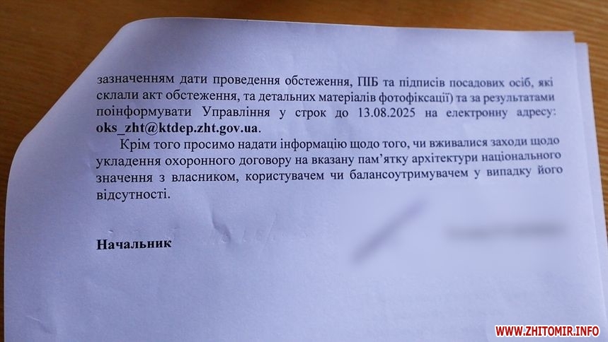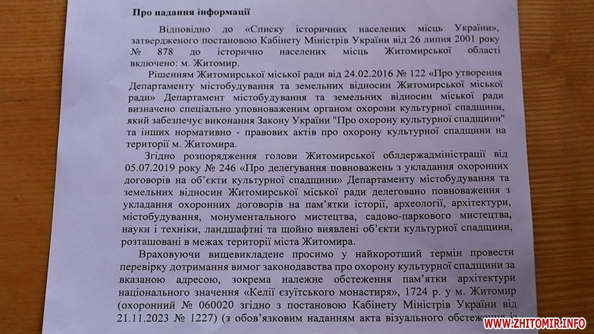 Ситуацію з пам’яткою архітектури журналістам Житомир.info прокоментували в управлінні культури та туризму Житомирської ОВА.