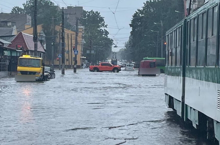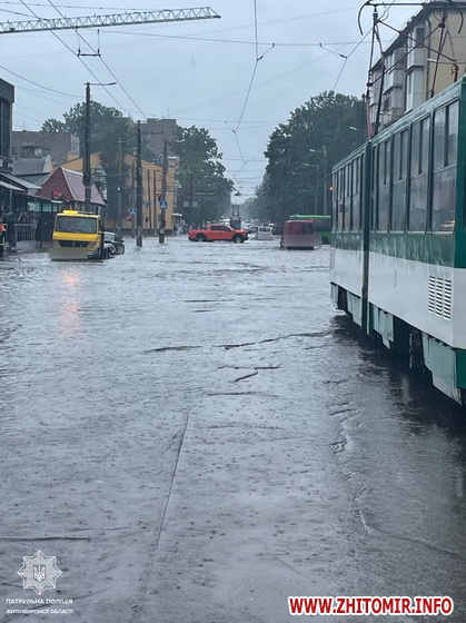Через сильну зливу 29 липня у Житомирі на перехресті вулиць Покровської та Михайла Грушевського ускладнений рух транспорту в обох напрямках.