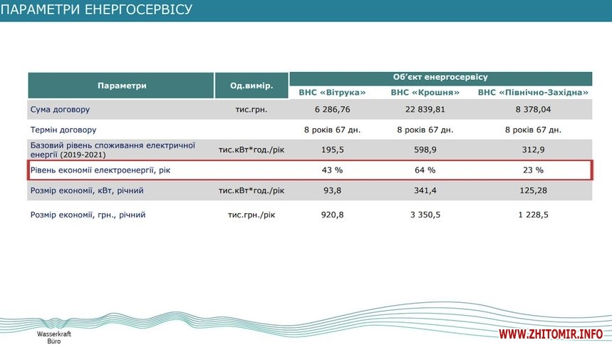 «Загальна вартість інвестицій по трьох насосних станціях – 37,5 млн грн». Щомісячно проводиться зняття всіх показників, а саме кількість поданої води й спожитої електроенергії. Це все перераховується в питому норму використаної електроенергії на кубічний метр, після порівнюється з питомою нормою, яка була закладена в тендері. Отримана економія перераховується і виплачується інвестору. 10% економії залишається для «Житомирводоканалу», а 90% виплачується інвестору протягом 8 років», – зазначає Роман Ілик.