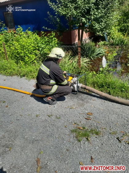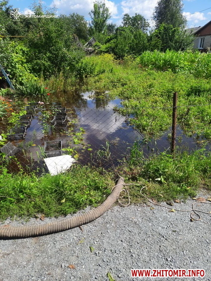 «Зокрема, було підтоплено території пʼяти приватних домоволодінь у Звягелі. Знадобилася допомога рятувальників у відкачці води. По прибуттю на місце події з’ясувалося, що підтоплені житлові будинки, господарчі будівлі та присадибні ділянки. Після восьмигодинної роботи, за допомогою автоцистерни та всмоктувального рукава, а також пожежної насосної станції бійці ДСНС відкачали близько 400 куб. м води», - йдеться у повідомленні.