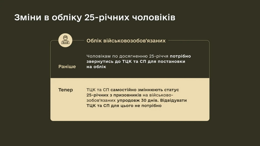 присвоєння військового звання «солдат (матрос) запасу» одночасно з прийняттям на військовий облік осіб, які досягли 25-річного віку та не проходили військову службу чи базову загальновійськову підготовку, без їх виклику до ТЦК та СП;