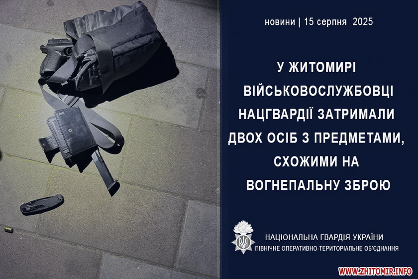 «Під час несення служби з охорони громадського порядку у місті Житомирі військовослужбовці Національної гвардії України затримали двох громадян, у яких було виявлено предмети, зовні схожі на вогнепальну зброю. Патрулюючи вулиці, до гвардійців звернулися перехожі та повідомили про здійснення пострілу невідомим чоловіком. Прибувши за вказаною адресою, військовослужбовці виявили групу осіб, які поводилися підозріло. Під час перевірки документів один з громадян повідомив про наявність у нього предмета, схожого на пістолет. Двоє інших, очевидно, занервували та намагалися залишити місце події. У ході огляду один із них продемонстрував предмет, зовні подібний до пістолета марки «Форт-17Р»», - йдеться у повідомленні.