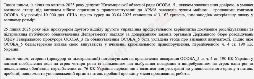 «Суд переконався, що укладення угоди сторонами є добровільним, тобто не є наслідком застосування насильства, примусу, погроз або наслідком обіцянок чи дій будь-яких інших обставин, ніж ті, що передбачені в угоді. Крім того, суд враховує, що ОСОБА_5 на обліку у лікарів нарколога та психіатра не перебуває, раніше не судимий, являється депутатом Житомирської обласної ради, має постійне місце проживання, щиро розкаявся у вчиненому. Обставиною, яка пом`якшує ОСОБА_5 покарання згідно зі ст. 66 КК України, є щире каяття та активне сприяння розкриттю кримінального правопорушення. Обставини, які обтяжують ОСОБА_5 покарання згідно зі ст. 67 КК України, відсутні», - йдеться у вироці.