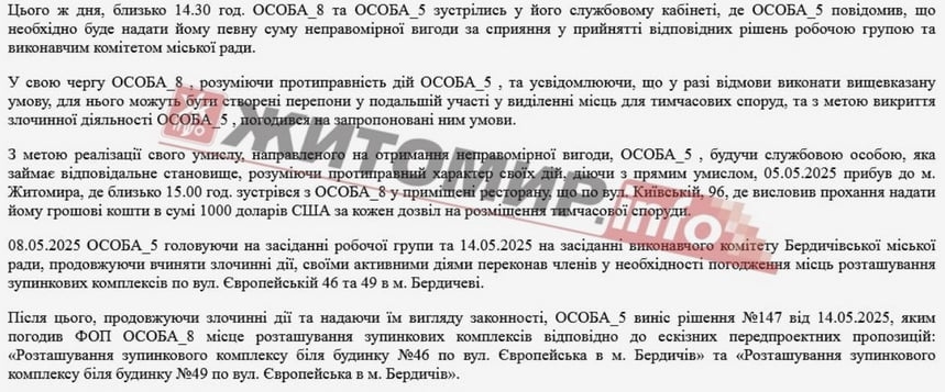 Зауважимо, що кримінальне провадження було відкрите 24 жовтня 2024 року – після того, як 15 жовтня 2024 року Орлюк особисто зустрівся з підприємцем, який з липня 2024 року підшукував ділянки на території Бердичівської громади для встановлення МАФів з продажу продовольчих товарів та тютюнових виробів.
