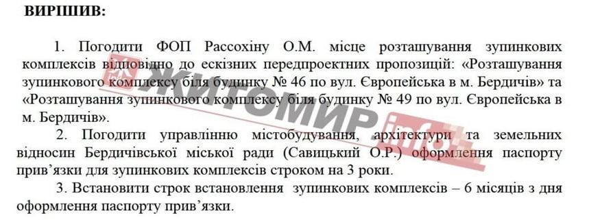 Нижче – скриншот з ухвали суду та рішення виконавчого комітету Бердичівської міської ради про погодження місць розташування зупинкових комплексів у м. Бердичеві по вул. Європейська, біля будинку № 46 та № 49: