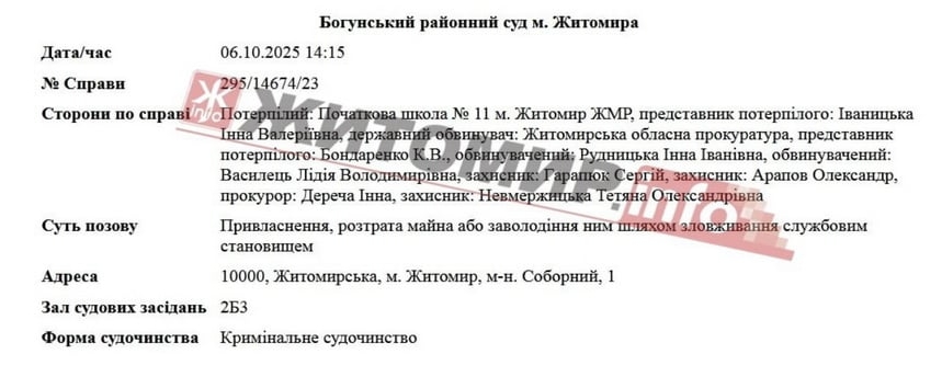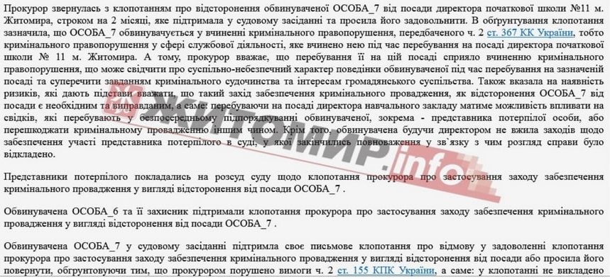 «Клопотання прокурора про відсторонення обвинуваченої ОСОБА_7 від посади директора початкової школи №11 м. Житомира, строком на 2 місяці задовольнити. Відсторонити ОСОБА_7 від посади директора початкової школи № 11 міста Житомира на строк до 23.10.2025 (включно)», - йдеться в ухвалі суду.