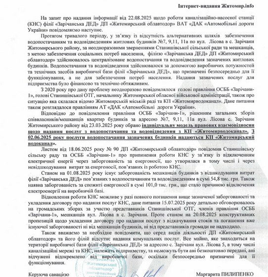 «Відновлення роботи KHC можливе у разі повного погашення вище зазначеної заборгованості та укладення договору про надання послуг KHC, дане питання 15.07.2025 року детально обговорювалось на громадських зборах за участю представників Станишівської ОТГ, членів правління ОСББ «Зарічани-1», мешканців вул. Лісова в с. Зарічани. Проте станом на 20.08.2025 конструктивних пропозицій щодо укладення договору про надання послуг з відкачування стоків та погашення вже існуючої заборгованості ні від мешканців будинків, ні від представників громади не надходило», - йдеться у відповіді на інформаційний запит.