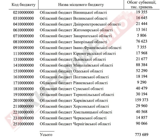 Згідно з додатком, Житомирська область на придбання шкільних автобусів отримає 13,1 млн грн.