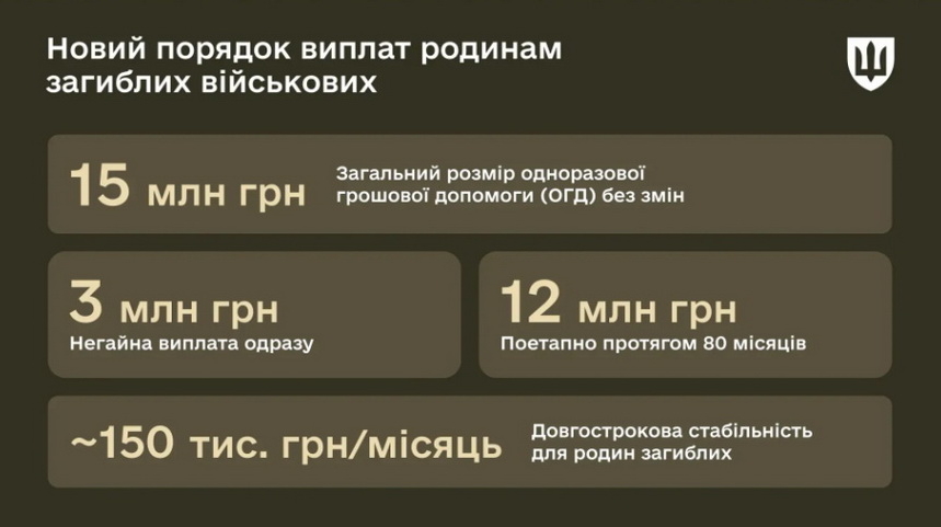 - виплата 4/5 від суми допомоги (12 млн грн) проводитиметься поетапно протягом 80 місяців за фіксованим графіком. Це еквівалентно орієнтовно 150 тис. грн щомісяця, що забезпечує довгострокову фінансову опору родинам.