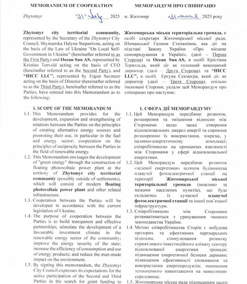 «Розглянувши меморандум про співпрацю, укладений між Житомирською міською радою, компанією «Ocean Sun AS», та компанією «Нicc LLC», який передбачає розвиток, розширення та зміцнення відносин між сторонами щодо створення та експлуатації відновлювальних джерел енергії, затвердити меморандум про співпрацю, укладений між Житомирською міською радою, компанією «Ocean Sun AS» та компанією «Нicc LLC» від 31.07.2025, що додається», - йдеться у проєкті рішення.