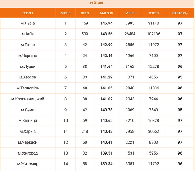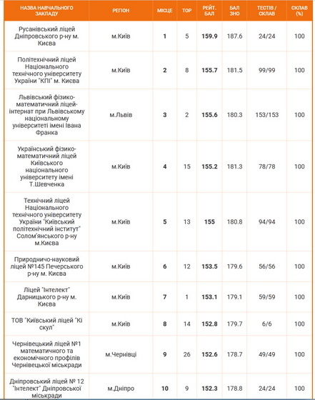 106 місце – ліцей № 1 міста Житомира: середній бал 158,4, складали тести 100 учнів;