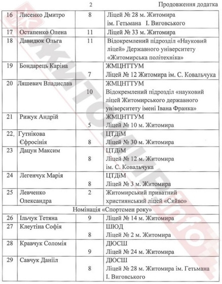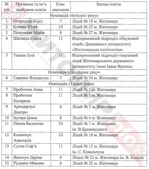 Як повідомляв Житомир.info, у 2024 році в Житомирі 27 учнів та вихованців закладів освіти міської територіальної громади, переможці загальноміського конкурсу «Обдарованість року 2024» отримали стипендії розміром 1000 гривень кожен.