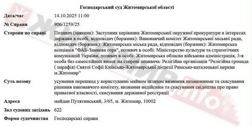 Ухвалою від 19 вересня 2025 року Господарський суд відкрив провадження у справі за позовом заступника керівника Житомирської окружної прокуратури в інтересах держави в особі Житомирської обласної військової адміністрації, Міністерства культури та стратегічних комунікацій України до виконавчого комітету Житомирської міської ради, Житомирської міської ради, Житомирської асоціації «ФАБ-Замкова гора» про усунення перешкод у користуванні майном шляхом визнання незаконними та скасування рішення виконавчого комітету, визнання недійсним та скасування свідоцтва про право приватної власності, скасування державної реєстрації.