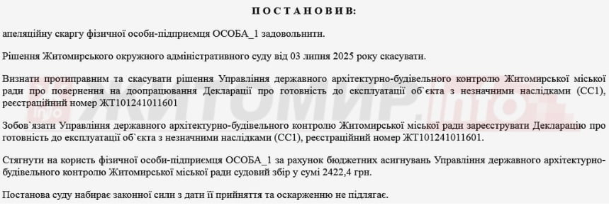 Нагадаємо, в листопаді 2024 року депутат Житомирської міської ради, підприємець Сергій Пидюра звернувся до суду з позовом, в якому просив зобов’язати управління державного архітектурно-будівельного контролю Житомирської міської ради зареєструвати декларацію про готовність до експлуатації об`єкта на вулиці Хлібній, 18-а. Рішенням від 3 липня 2025 року Житомирський окружний адміністративний суд відмовив у задоволенні позову.