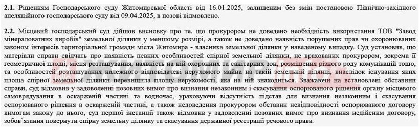 Касаційну скаргу першого заступника керівника Рівненської обласної прокуратури залишити без задоволення, а постанови Північно-західного апеляційного господарського суду від 09.04.2025 і рішення Господарського суду Житомирської області від 16.01.2025 – без змін.