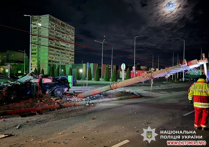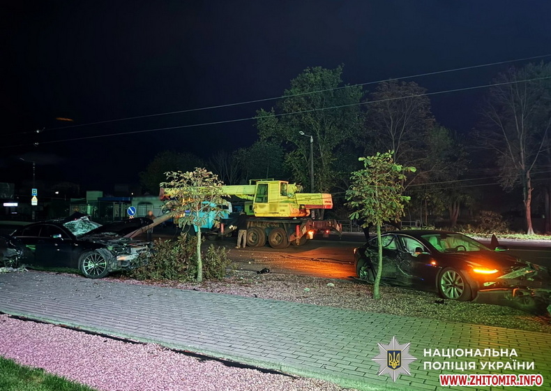 «Дорожньо-транспортна пригода сталася уночі 14 жовтня на проспекті Незалежності в обласному центрі. На місці події працювала слідчо-оперативна група Житомирського райуправління поліції № 1. Попередньо, близько 00:10 відбулося зіткнення попутних автомобілів Tesla під керуванням 20-річного містянина та Mercedes, за кермом якого перебував 22-річний житель обласного центру. Після цього останній здійснив наїзд на електроопору. Унаслідок ДТП травми отримав водій Mercedes та його пасажир, 24-річний житель Житомирського району. Обох молодиків було госпіталізовано», - йдеться у повідомленні.
