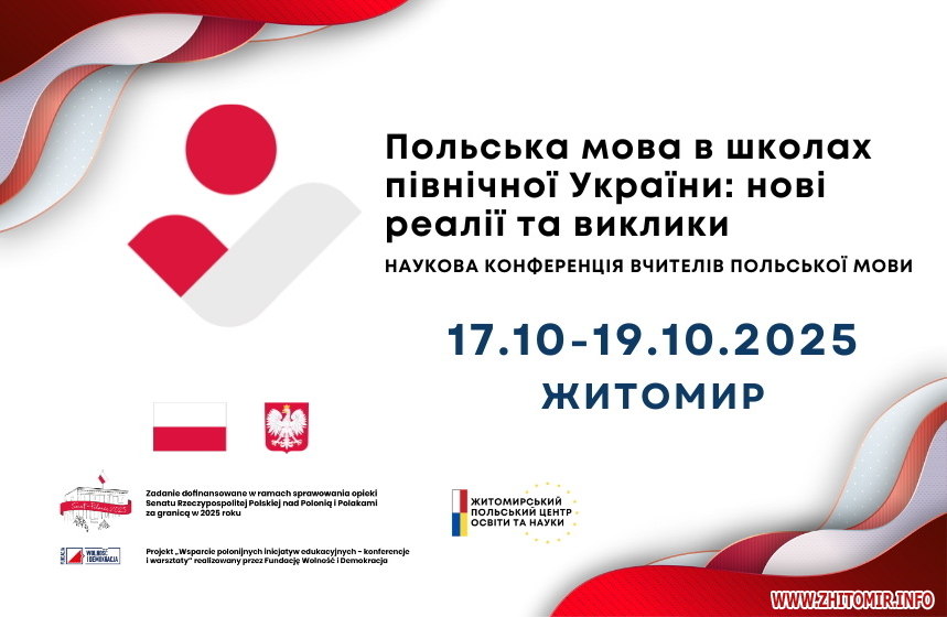 Житомирський Польський Центр Освіти і Науки запрошує на наукову конференцію вчителів польської мови «Польська мова в школах північної України: нові реалії та виклики», яка відбудеться у 17-19 жовтня 2025 році в Житомирі. Захід стане унікальною платформою для професійного діалогу, обміну досвідом та пошуку ефективних рішень у сфері викладання польської мови.