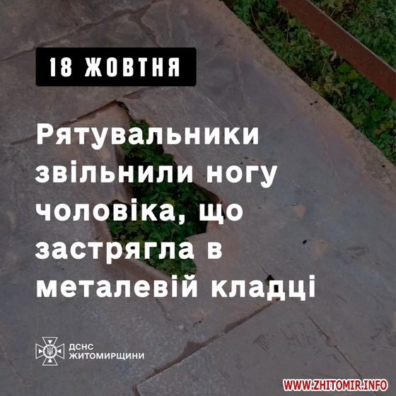 «18 жовтня о 17:11 до Служби порятунку «101» надійшло повідомлення про те, що поблизу села Станишівка Житомирського району 60-річний чоловік застряг ногою в металевій кладці через річку Тетерів. Прибувши на місце події, рятувальники за допомогою гідравлічного інструменту обережно розширили отвір та визволили кінцівку чоловікову. На щастя, медичної допомоги він не потребував і зміг самостійно продовжити свій шлях», - йдеться в повідомленні.