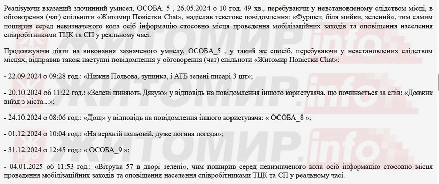 «При цьому, у чаті зазначеної спільноти з метою приховування протиправної діяльності її учасників розміщено інструкції щодо необхідності використання у повідомленнях умовних позначень, які вказували б на проведення військовослужбовцями ТЦК та СП мобілізаційних заходів, зокрема, «зелені», «гроза», «погана погода», «облава», «засада», «пишуть» тощо, з чим також ознайомився ОСОБА_5 (ред. обвинувачений). У цей момент у ОСОБА_5 виник злочинний умисел, направлений на перешкоджання законній діяльності військових формувань — ТЦК та СП в особливий період, шляхом поширення в обговоренні (чаті) спільноти «Житомир Повістки Chat» у реальному часі інформації щодо місць законної діяльності їх співробітників-військовослужбовців з проведення мобілізаційних заходів», - йдеться у матеріалах суду.