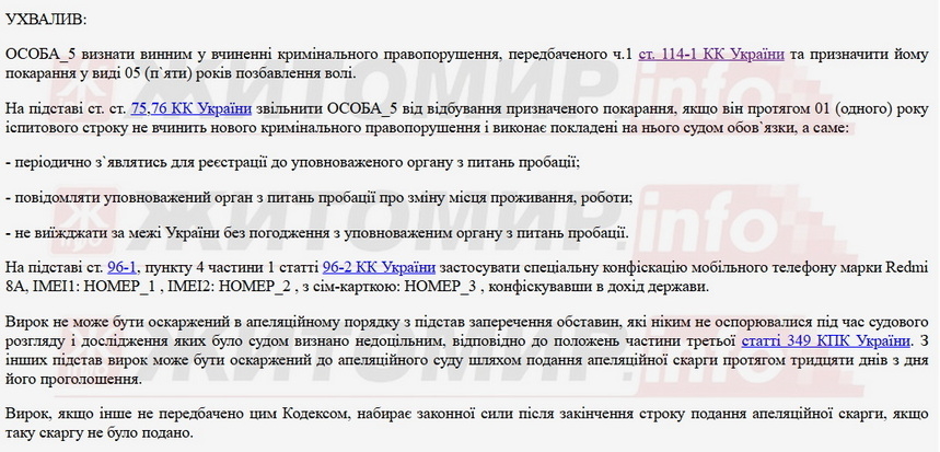 Суд визнав чоловіка винним за ч. 1 ст. 114-1 КК України (Несанкціоноване поширення інформації про направлення, переміщення зброї, озброєння та бойових припасів в Україну, рух, переміщення або розміщення Збройних Сил України чи інших утворених відповідно до законів України військових формувань, вчинене в умовах воєнного або надзвичайного стану) та призначив йому покарання у виді 5 років позбавлення волі. Однак житомирянина звільнили від відбування призначеного покарання, якщо він протягом одного року іспитового строку не вчинить нового кримінального правопорушення.